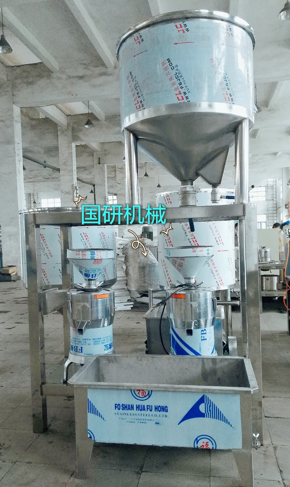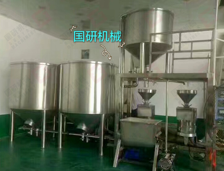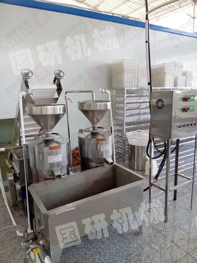 加工豆腐有六道工序:清洗浸泡(夏天4個(gè)小時(shí),冬天6個(gè)小時(shí),目的是更大限度的確保出漿率)—磨漿分離(傳統(tǒng)工藝需要人工篩漿,而機(jī)器是采用漿渣自動(dòng)分離,減輕了人力,極大提高生產(chǎn)效率)—高溫煮漿(豆?jié){自動(dòng)流入煮漿桶,通過蒸汽加熱煮熟)—點(diǎn)漿(豆?jié){煮開后,再加入凝固劑成型)—壓榨(擠出水份)—成品豆腐。