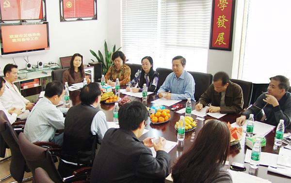 廣州市非公經濟組織創先爭優活動指導小組在國研機械公司調研(中為廣州市工商局副局長周邦華)